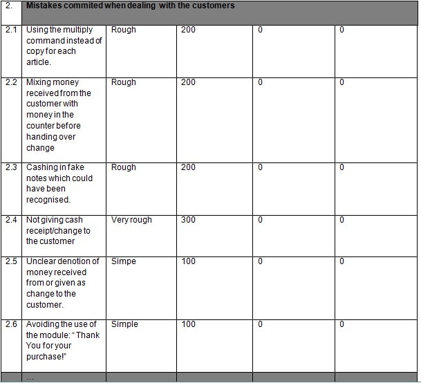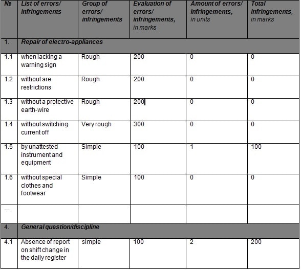 Let’s agree that the aim of any fine is not to compensate for a loss, but to reduce the probability of repeating the accident.If the loss occurred due to the fault/error of the employee surpasses his salary, then it is our duty to develop a "defense against fools", and not to define the amount of the punishment. There is no not much to gain by defining this amount. The employee will already be scared "to death", but he will not be able to correct the situation.Typical violations are gathered for each position on a different check-list. On the check-list, the work is divided into blocks, and the calculation of marks is as follows: