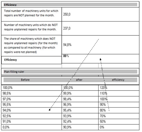 In order to stimulate the qualitative work of a mechanic at a garage, we can follow (for the current month/quarter) the percentage of machines which DO NOT require unplanned repairs as compared to all (those which did not have planned repairs).Hence if there are 300 units in the car park (50 of which are supposed have planned repairs for the current month and 250 are not), then in order to calculate the efficiency, the units which do not require repairs should be considered.